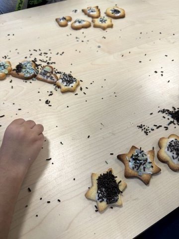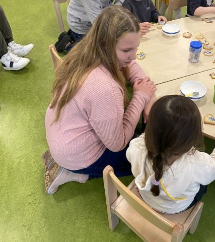 Wir haben für die Kinder Plätzchen gebacken und haben sie dann mit in die Kita genommen, damit wir sie mit den Kindern gemeinsam dekorieren können. Wir haben noch mit den Kindern gespielt und hatten noch Ausmalbilder dabei.